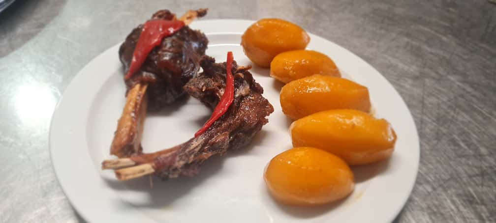 Receta tradicional preparada con carne de cabra seleccionada, cocinada lentamente hasta quedar tierna y llena de sabor. Se guisa con vino tinto, laurel, pimiento, ajo y especias que realzan su carácter intenso y aromático.